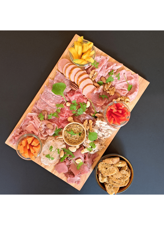 De box bevat een fijne selectie charcuterie, toast en toppings. Ideaal als aperoplank.