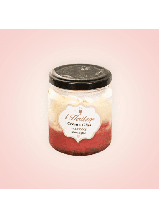 Crème-Glas van l’Heritage, een compleet dessert met een leuke twist. Frambozensorbet, een laagje krokante meringue, écht vanilleroomijs met verse hoevemelk, afgewerkt met méringue italienne en frambozencoulis van Frambiosa y Besos. Deze ijsbokaaltjes zijn gevuld met pure goesting!