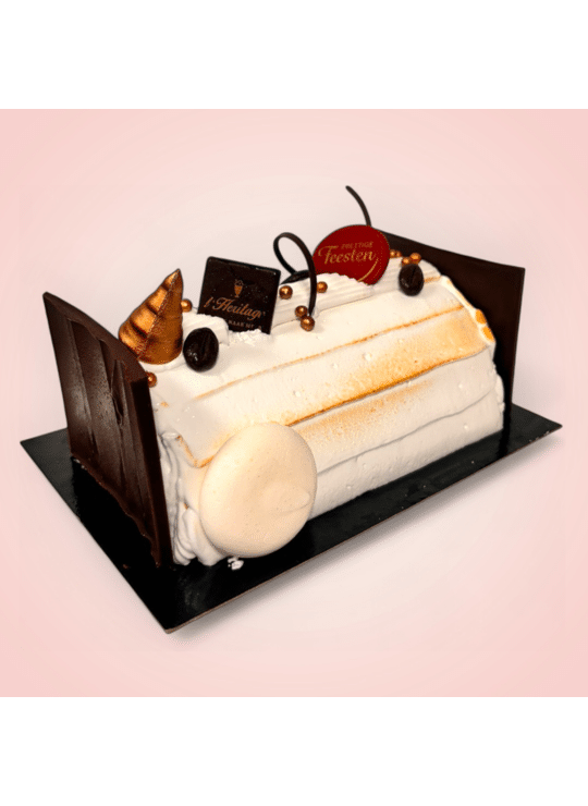 Heerlijk Bourbon Vanilleroomijs, gemaakt met verse hoevemelk en echte vanillestokken. Dit in combinatie met heerlijk chocoladeroomijs. Afgewerkt met zachte italiaanse meringue en eindejaarsversiering.
