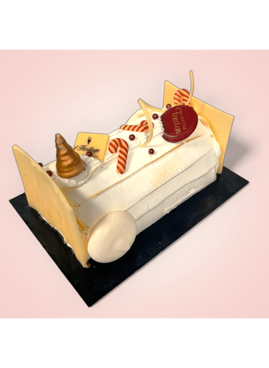 Heerlijk Bourbon Vanilleroomijs, gemaakt met verse hoevemelk en echte vanillestokken. Gecombineerd met sorbet framboos met frambozen uit de Westhoek. BINNENIN EEN LAAGJE KROKANTE MERINGUE. Afgewerkt met zachte italiaanse meringue en eindejaarsversiering.