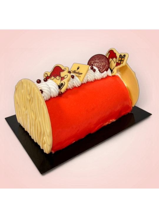 Roomijs met frambozen uit de Westhoek en vanilleroomijs op een biscuitbodem. Afgewerkt met een huisgemaakte ganache. Het perfecte huwelijk tussen vanille en verfrissende framboosjes.